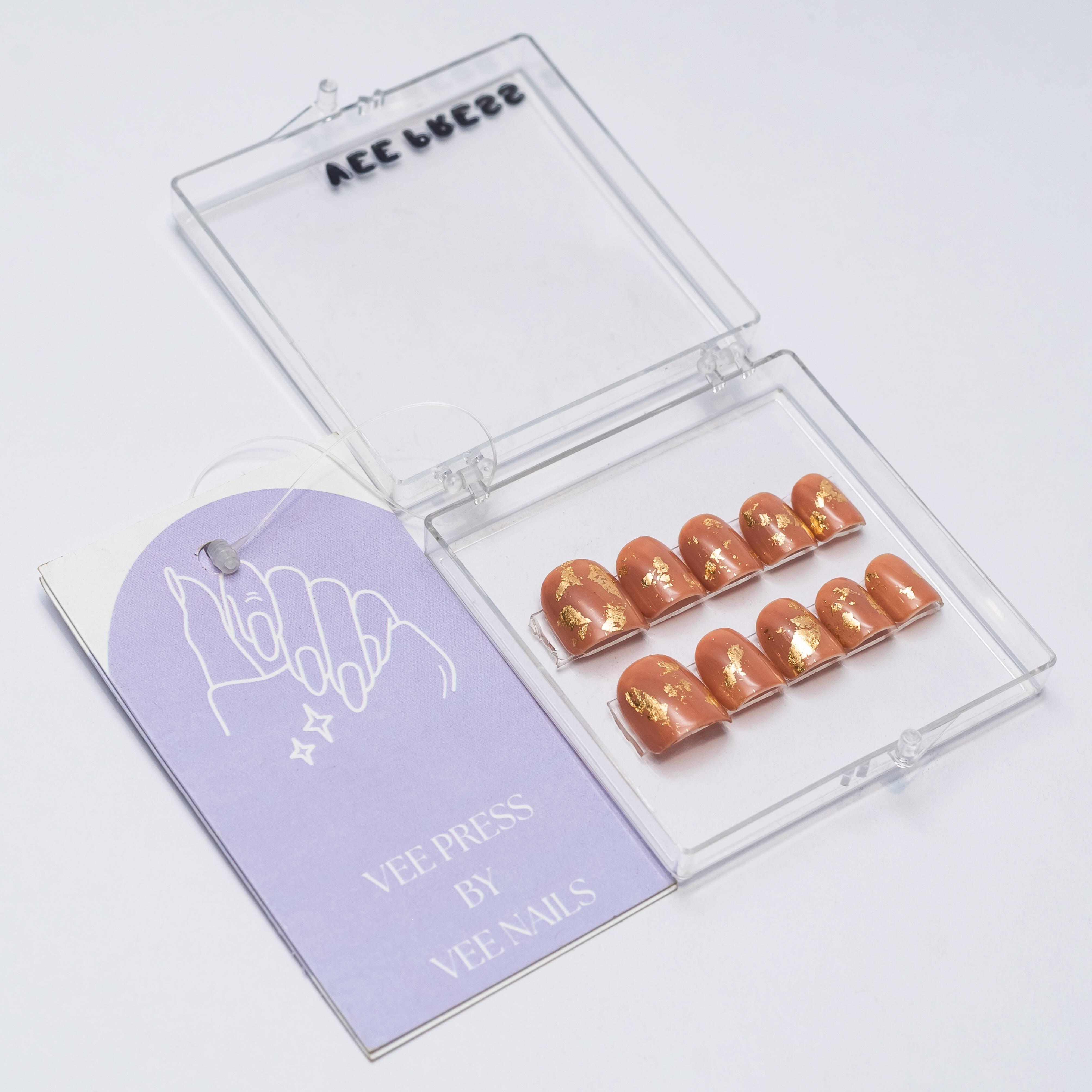 Elevate your nail game with Foil Fantasy, a set of press-on nails designed to exude class and sophistication. Featuring a stunning brown base adorned with subtle yet striking foil accents, this set is perfect for anyone who loves a touch of luxury in their everyday look. Whether you're heading to a glamorous event or simply want to treat yourself, Foil Fantasy is your ticket to flawless nails in no time.